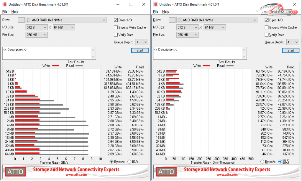 และถ้าใครอยากจะเช็คความความแรงในการส่งข้อมูลแบบทางโล่งๆ โปรแกรมนี้ทำให้เห็นได้ชัดเจนครับ กับค่า Seq Read/Write ระดับ 8.60/2.89GB/s กันเลยทีเดียว ตรงนี้ล่ะครับเป็นค่าที่ควรจะทดสอบได้ในหลายๆ Benchmark แต่ผมมองว่า อาจจะเห็นที่ตัว Benchmark เองด้วยว่าจะเขียนมาให้ดึงประสิทธิภาพของชุด RAID 0 บนชิปเซท AMD X570 ออกมาได้ดีสักแค่ไหน และอีกอย่างหนึ่งเลยก็คือ NVMe SSD ที่เรานำมาต่อ RAID 0 x3 ตัวในครั้งนี้ ก็ต่างรุ่น ต่างขนาด และต่างยี่ห้อกันด้วย ทำออกมาได้แค่นี้ก็ถือว่าหรูมากแล้วล่ะครับ x_x…