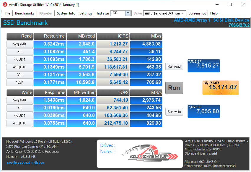 ส่วนโปรแกรม Anvil’s ก็เป็นอีกหนึ่ง Benchmark ที่ดึงประสิทธิภาพของ NVMe RAID 0 x3 ตัวนี้ออกมาได้ไม่หมดครับ…