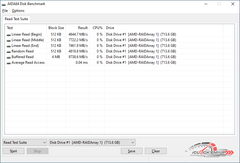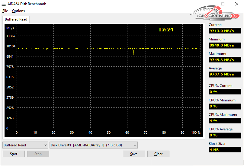 ส่วน AIDA64 Disk Benchmark นั้นในหัวข้อทดสอบของ Read Test Suite นั้นยังพอจะเห็น Read ในระดับ 7,464 ถึง 7,722MB/s ได้อยู่นะครับ ^^” และในส่วนของ Buffered Read นั้นทำออกมาได้ถึง 9,738.6MB/s กันเลยทีเดียว หุหุ…