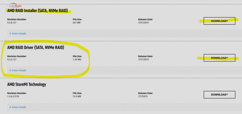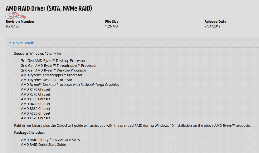 จากนั้นก่อนที่จะลง Windows 10 64bit 1903 เราต้องเตรียม Driver ของ AMD Raid ให้พร้อมก่อนลงครับ มิเช่นนั้น เราจะเห็นเป็น SSD 3 ลูกแยกกันตอนช่วงเลือก Drive จะลง OS ขั้นตอนแรกไปโหลด AMD RAID Drive (SATA, NVMe RAID) มาก่อนครับ ขนาดไฟล์ 1.26MB เมื่อได้ไฟล์มาแล้ว ก็เอาไปแตกไว้ในห้องเดียวกับตัว USB ที่เป็นตัวลง OS ได้เลยครับ เพื่อเราจะได้เลือก Browse Driver ของ RAID ก่อนที่จะลง