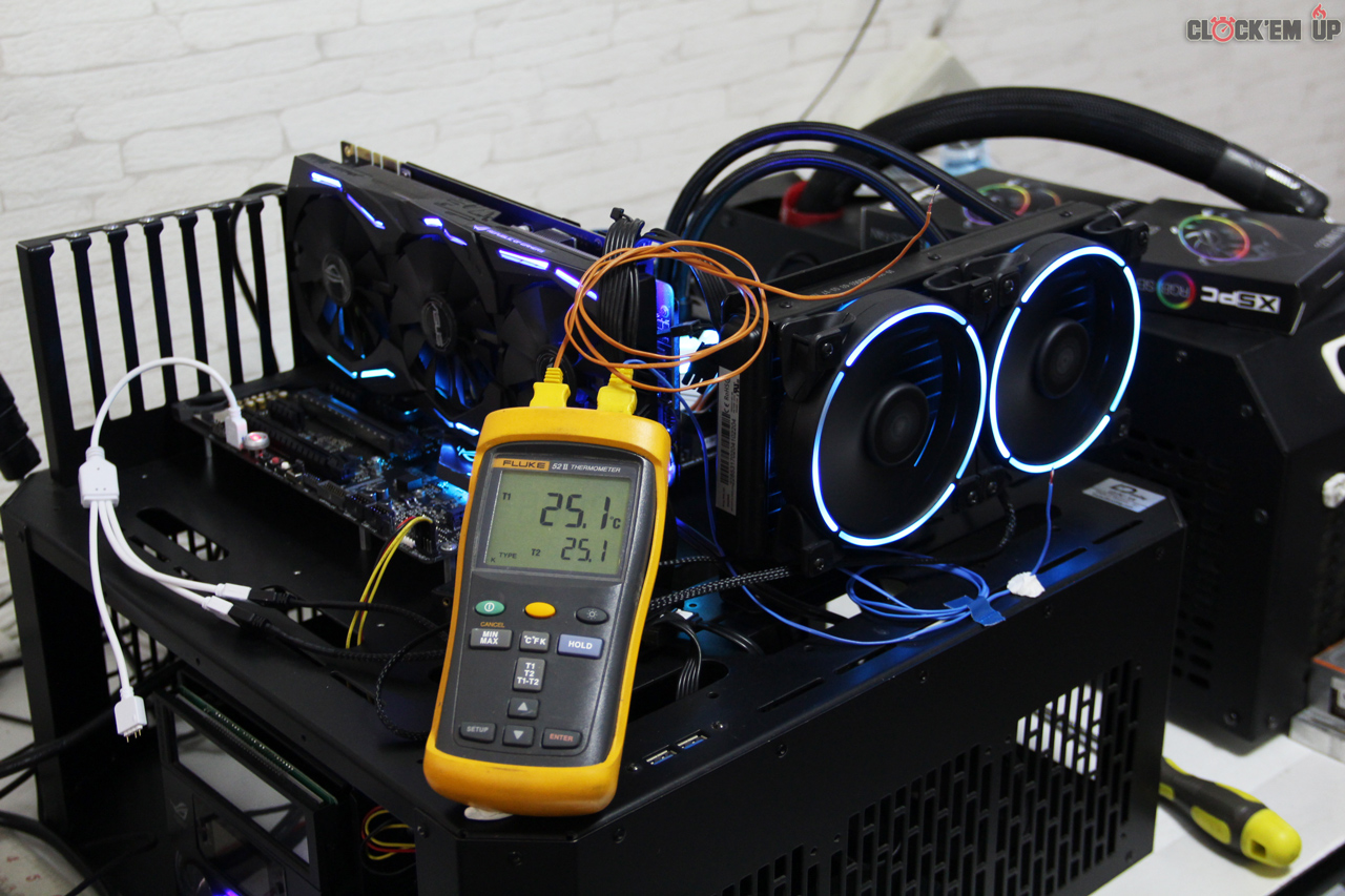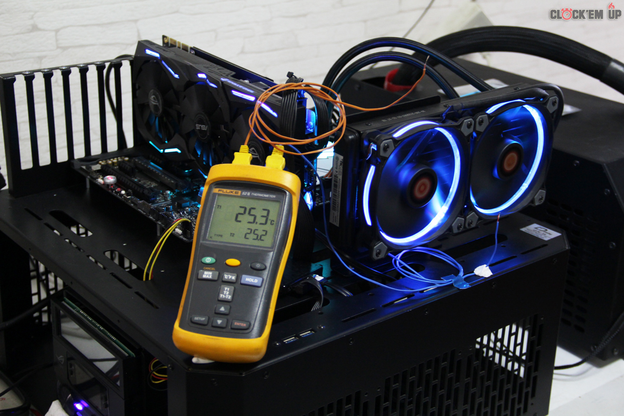 ภาพบรรยากาศในการทดสอบในครั้งนี้ครับ โดยเราจะทดสอบในห้องแอร์ อุณหภูมินั้นเราพยายามควบคุมอากาศบริเวณจุดทดสอบและลมเข้าตัวหม้อน้ำให้อยู่ในช่วง 24c ถึง 25c องศาเซสเซียส ตลอดการทดสอบ โดยเน้นไม่ให้เย็นต่ำกว่า 24c และไม่ให้ร้อนเกิน 26c องเซสเซียส จากนั้นก็เก็บผลการทดสอบการ Burn-in CPU ด้วยโปรแกรม CPU PowerMAX (AVX) เป็นเวลา 5 นาที จำนวน 3 รอบแล้วหาค่าเฉลี่ยทางด้านอุณหภูมิในการทดสอบ