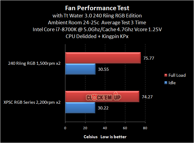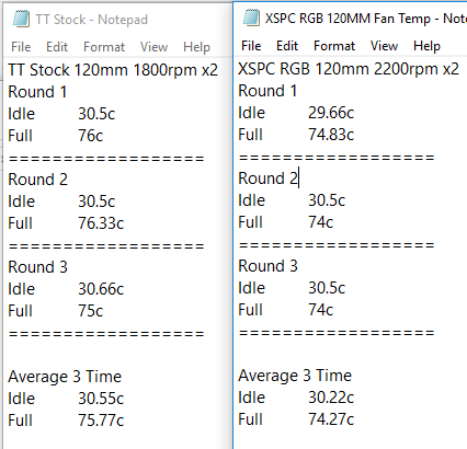 ผลการทดสอบทางด้านประสิทธิภาพที่ทำได้ออกมานั้นก็ถือว่าอยู่ในเกณฑ์ที่ควรจะเป็นคือเมื่อเปี่ลยพัดลมที่รอบสูงขึ้นให้แก่ตัวหม้อน้ำ มันก็ต้องเย็นลง อย่างน้อย 1-2c องศาเซลเซียสได้เป็นอย่างน้อย และผลทดสอบแบบไฟล์ดิบๆ ด้านบนนี้ของการทดสอบด้วยชุดน้ำ AIO ของ Tt Water 3.0 240 Riing RGB ด้วยพัดลมเดิมๆ รอบ 1500rpm. x2 ตัวเทียบกับ XSPC EGB Series 120mm 2200rpm. x2 ในการทดสอบทั้ง 3 รอบก็พบว่าพัดลมรอบสูงกว่าก็สามารถทำความเย็นให้กับ CPU ได้เย็นกว่าตามหลักที่ควรจะเป็น โดยสามารถทำได้เย็นขึ้นได้ในช่วง Full Load ในช่วง 1c ถึง 2.33c องศาเซลเซียส สูงสุดครับ